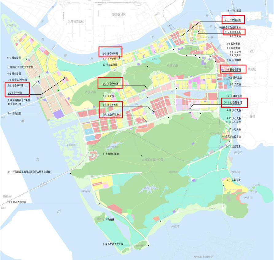 橫琴新區(qū)2018年社會(huì)停車場(chǎng)建設(shè)目前規(guī)劃的10個(gè)停車場(chǎng),分別位于橫琴規(guī)劃結(jié)構(gòu)的“三片,十區(qū)”。本項(xiàng)目包含9個(gè)停車場(chǎng)工程的建設(shè),項(xiàng)目總用地面積約40700㎡,建設(shè)內(nèi)容主要包括9個(gè)地塊的地下停車場(chǎng)及其配套設(shè)備用房、停車場(chǎng)地面廣場(chǎng)與綠化等。9個(gè)停車場(chǎng)位置情況如下: