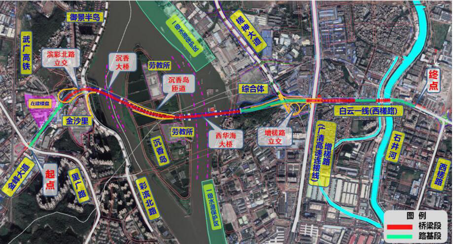 4.建設(shè)規(guī)模:路線全長約 3.89km,紅線寬度 42-61m,采用Ⅱ級(jí)公路兼城市主干路標(biāo)準(zhǔn),設(shè)計(jì)速度 60km/h,雙向 8 車道。全線設(shè)置 2 座跨越珠江特大橋(沉香大橋、西華海大橋),2 處立交(彩濱北路立交、增槎路立交),2 座匝道(沉香島匝道)。