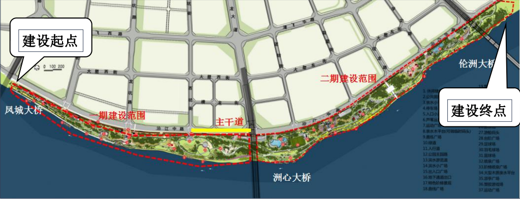 本項目建設(shè)用地總面積為497615㎡,主要建設(shè)內(nèi)容包括:土方工程、園路與地面硬化工程、植被小品工程、綠化工程、配套用房建筑工程、室外體育活動場地工程以及配套設(shè)施工程等,分兩期建設(shè)。一期由鳳城大橋至洲心大橋,二期由洲心大橋至倫洲大橋。配套市政道路主線路全長約520m,道路紅線寬33.5m,建設(shè)內(nèi)容包括道路工程、交通工程、排水工程、照明工程、綠化工程及其他零星工程,于一期工程中實施。