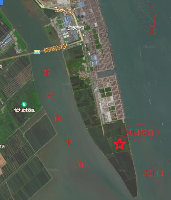 (二)建設地點:廣州港南沙作業(yè)區(qū)南部順岸碼頭,規(guī)劃龍穴島島體的偏南端,北側(上 游)緊接在建的廣州港南沙港區(qū)國際通用碼頭工程,與已建南沙港區(qū)三期工程距離約1.5km。
