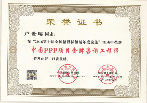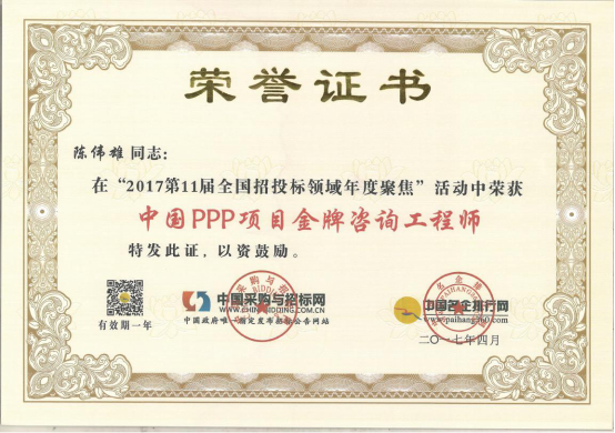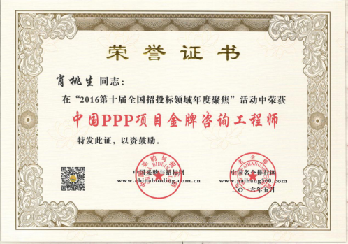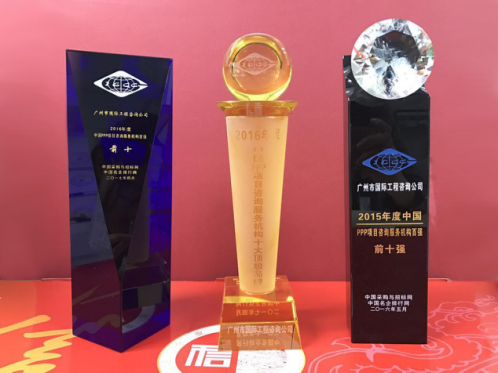 為在PPP咨詢行業(yè)內(nèi)樹(shù)立標(biāo)桿企業(yè),國(guó)家發(fā)改委中國(guó)投資協(xié)會(huì)項(xiàng)目投融資專業(yè)委員會(huì)、中國(guó)采購(gòu)與招標(biāo)網(wǎng)、中國(guó)名企排行網(wǎng)聯(lián)合主辦了“第10、11屆PPP咨詢服務(wù)機(jī)構(gòu)評(píng)價(jià)推薦”活動(dòng)。秉承“公開(kāi)、公平、公正、誠(chéng)實(shí)信用”的原則,最終遴選出年度中國(guó)PPP咨詢服務(wù)機(jī)構(gòu)類大獎(jiǎng)。在活動(dòng)中,廣州市國(guó)際工程咨詢公司榮獲“2015、2016年度中國(guó)PPP項(xiàng)目咨詢服務(wù)機(jī)構(gòu)百?gòu)?qiáng)(前十強(qiáng))”,”2016年度中國(guó)PPP項(xiàng)目咨詢服務(wù)機(jī)構(gòu)十大頂級(jí)品牌”、”2016年度中國(guó)PPP項(xiàng)目咨詢服務(wù)最佳智庫(kù)獎(jiǎng)”、”2015年度廣東省PPP項(xiàng)目咨詢服務(wù)機(jī)構(gòu)首選品牌”、”2015年度市政基礎(chǔ)設(shè)施PPP項(xiàng)目咨詢服務(wù)機(jī)構(gòu)首選品牌”等集體榮譽(yù)類大獎(jiǎng)。此外,公司PPP項(xiàng)目咨詢中心主任肖桃生、副主任盧世君、陳偉雄、孫亮分別榮獲2015、2016年度中國(guó)PPP項(xiàng)目金牌咨詢工程師稱號(hào)。