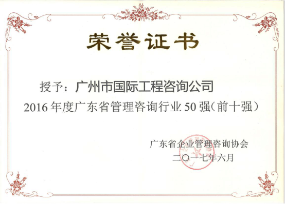 2017年6月24、25日,由廣東省企業(yè)管理咨詢協(xié)會(huì)組織的“第十屆國際管理咨詢師活動(dòng)日暨首屆中國制造100年高峰論壇活動(dòng)”于深圳隆重舉行。大會(huì)表彰了一批廣東省管理咨詢行業(yè)先進(jìn)單位,其中,廣州市國際工程咨詢公司榮獲“2016年度廣東省管理咨詢行業(yè)50強(qiáng)(前十強(qiáng))”和“2017年廣東省中小企業(yè)優(yōu)秀服務(wù)機(jī)構(gòu)100佳”稱號。張維副總經(jīng)理作為公司代表參與了此次表彰活動(dòng)。