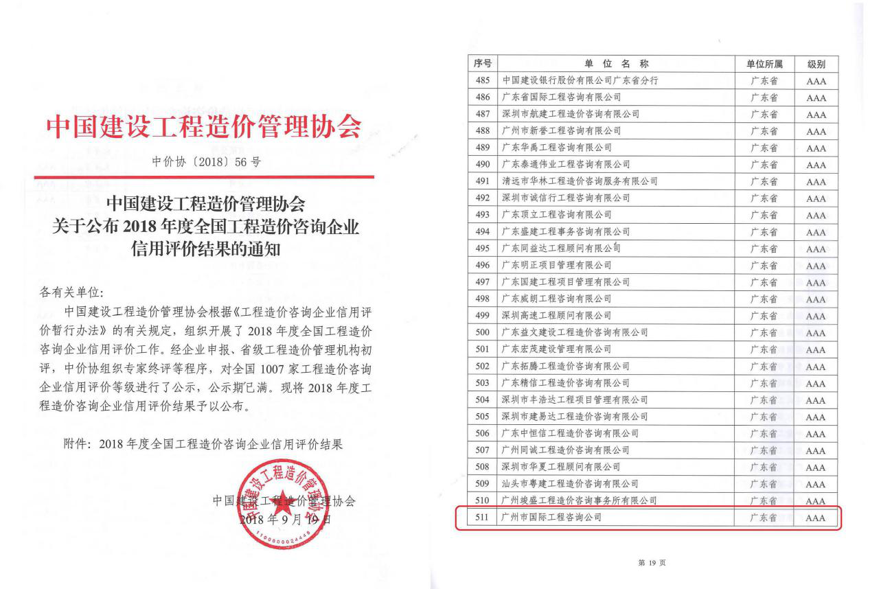 根據(jù)《工程企業(yè)信用評(píng)價(jià)暫行辦法》、《中國(guó)建設(shè)工程造價(jià)管理協(xié)會(huì)關(guān)于開(kāi)展2018年工程造價(jià)咨詢(xún)企業(yè)信用評(píng)價(jià)工作的通知》(中價(jià)協(xié)〔2018〕2號(hào))、《廣東省工程造價(jià)協(xié)會(huì)關(guān)于開(kāi)展2018年工程造價(jià)咨詢(xún)企業(yè)信用評(píng)價(jià)工作的通知》(粵價(jià)協(xié)〔2018〕1號(hào))等文件要求,我司在今年3月開(kāi)啟了2018年工程造價(jià)咨詢(xún)企業(yè)信用評(píng)價(jià)的申報(bào)工作。在公司多個(gè)部門(mén)一個(gè)多月的通力協(xié)作下,繼獲得廣東省造價(jià)管理協(xié)會(huì)優(yōu)秀的初評(píng)成績(jī)后,經(jīng)過(guò)中國(guó)建設(shè)工程造價(jià)管理協(xié)會(huì)的審查評(píng)定,我司最終獲得了工程造價(jià)咨詢(xún)企業(yè)信用評(píng)價(jià)AAA級(jí)(最高等級(jí)),這是自2015年中國(guó)建設(shè)工程造價(jià)管理協(xié)會(huì)首次開(kāi)展工程造價(jià)咨詢(xún)企業(yè)信用評(píng)價(jià)工作以來(lái),我司連續(xù)兩次獲評(píng)工程造價(jià)咨詢(xún)企業(yè)信用評(píng)價(jià)AAA級(jí)。