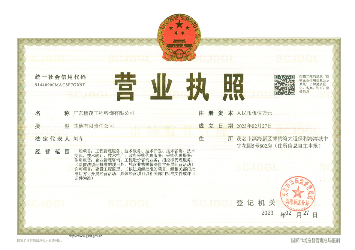 在茂名市人民政府、廣州產(chǎn)業(yè)投資控股集團(tuán)有限公司的關(guān)心和大力支持下,廣州國(guó)際咨詢公司與茂名港集團(tuán)共同設(shè)立的廣東穗茂工程咨詢有限公司(下稱“穗茂咨詢”)于2023年2月27日在茂名市完成工商注冊(cè)。