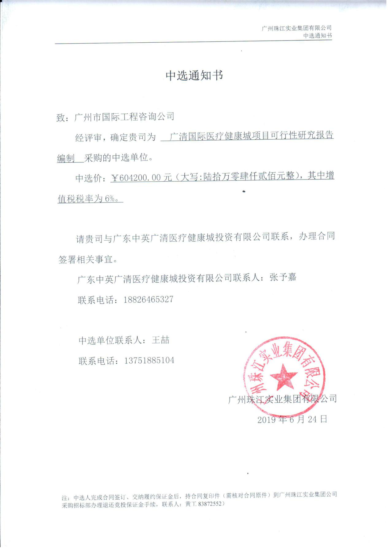 6月19日,廣州珠江實(shí)業(yè)集團(tuán)有限公司對(duì)廣清國(guó)際醫(yī)療健康城項(xiàng)目可行性研究報(bào)告采購(gòu)進(jìn)行邀請(qǐng)招標(biāo),經(jīng)評(píng)委評(píng)審,確定廣州市國(guó)際工程咨詢公司為該項(xiàng)目的中選單位。