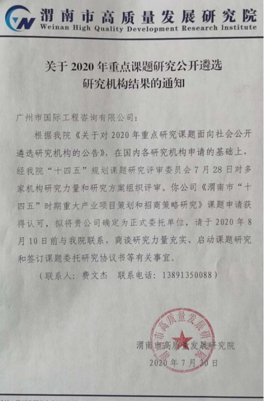 近日,經(jīng)陜西省渭南市“十四五”規(guī)劃課題研究評審委員會評審,廣州市國際工程咨詢有限公司在多家研究機構(gòu)選聘中脫穎而出,成功中標《渭南市“十四五”時期重大產(chǎn)業(yè)項目策劃和招商策略研究》課題。其后,我司將繼續(xù)申請渭南市新一輪公開遴選的“十四五”規(guī)劃前期重大研究課題,以進一步開拓我司在中西部地區(qū)的市場領(lǐng)域,擴大我司高端智庫品牌的知名度。截止目前為止,2020年我司已累計承接國民經(jīng)濟和社會發(fā)展“十四五”規(guī)劃、“十四五”專項規(guī)劃、“十四五”規(guī)劃前期研究課題達12項,成績喜人。