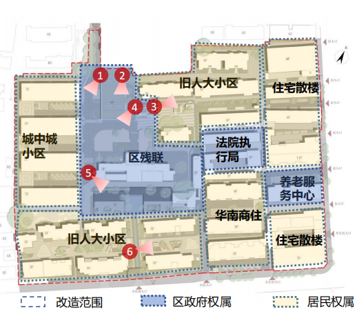 花都區(qū)舊人大小區(qū)建于80-90年代,小區(qū)改造用地面積約35800平方米,建筑總面積約65972平方米,樓棟數(shù)30棟,居民戶數(shù)719戶,無業(yè)委會與物業(yè)單位。小區(qū)地塊內(nèi)部組成復(fù)雜,包括舊人大小區(qū)、城中城小區(qū)、區(qū)殘聯(lián)、法院執(zhí)行局、舊人大辦公樓、華南商住、養(yǎng)老服務(wù)中心及住宅散樓等?;ǘ紖^(qū)舊人大小區(qū)具有黨建文化氛圍濃厚、空間充足以及可利用資源基礎(chǔ)良好等優(yōu)勢,適宜作為先行先試的示范項目。2021年3月經(jīng)花都區(qū)政府同意確定將舊人大小區(qū)項目作為花都區(qū)老舊小區(qū)有機(jī)更新項目的示范區(qū)。項目實施內(nèi)容主要包括新建立體機(jī)械停車樓、利用現(xiàn)狀閑置公房改造成鄰里中心、小區(qū)公共空間(美好會客廳)、兒童娛樂設(shè)施、信息標(biāo)識、充電樁、危房加固、智慧設(shè)施及藝術(shù)彩繪。